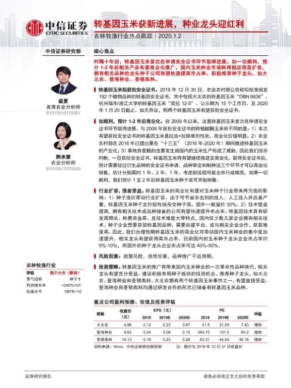 【中信证券】【20200102】农林牧渔行业热点跟踪:转基因玉米获新进展,种业龙头迎红利-2页 行业研究