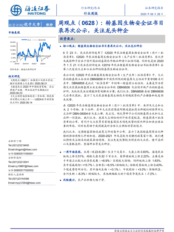 【海通证券】【20200628】20200628-海通证券-农业周观点:转基因生物安全证书目录再次公示,关注龙头种企-4页 行业研究
