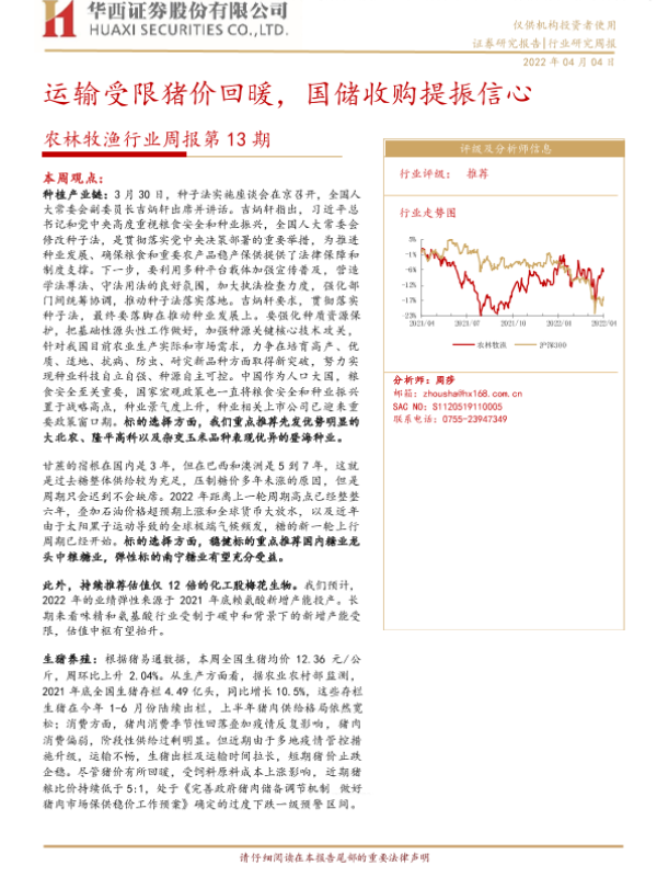 【华西证券】【20220404】农林牧渔行业周报第13期:运输受限猪价回暖,国储收购提振信心-23页 行业研究