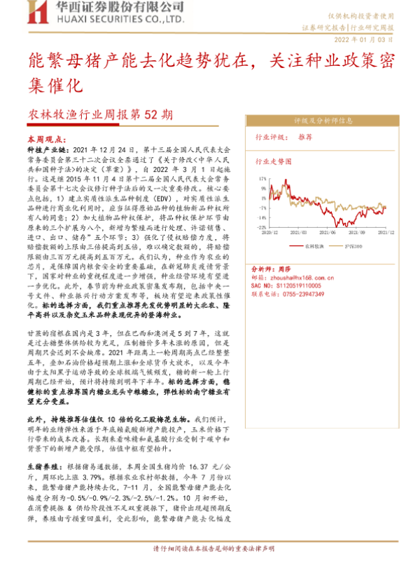 【华西证券】【20220103】20220103-华西证券-农林牧渔行业周报第52期:能繁母猪产能去化趋势犹在,关注种业政策密集催化-23页 行业研究