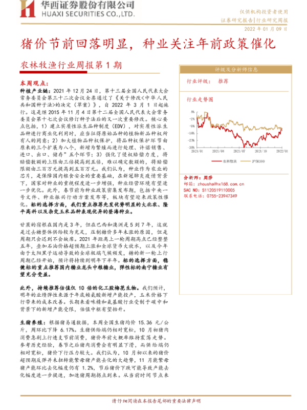 【华西证券】【20220109】20220109-华西证券-农林牧渔行业周报第1期:猪价节前回落明显,种业关注年前政策催化-23页 行业研究