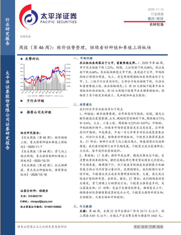 【太平洋证券】【20201115】20201115-太平洋-农林牧渔周报(第46周):粮价强势整理,继续看好种植和养殖上游板块-15页 行业研究