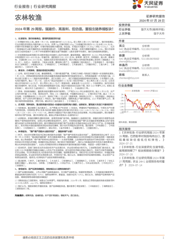 【天风证券】【20240728】2024年第29周报:强猪价、高盈利、低估值,重视生猪养殖板块!-14页 行业研究