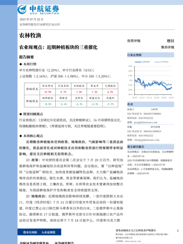 【中航证券】【20230722】农业周观点:近期种植板块的三重催化-14页 行业研究