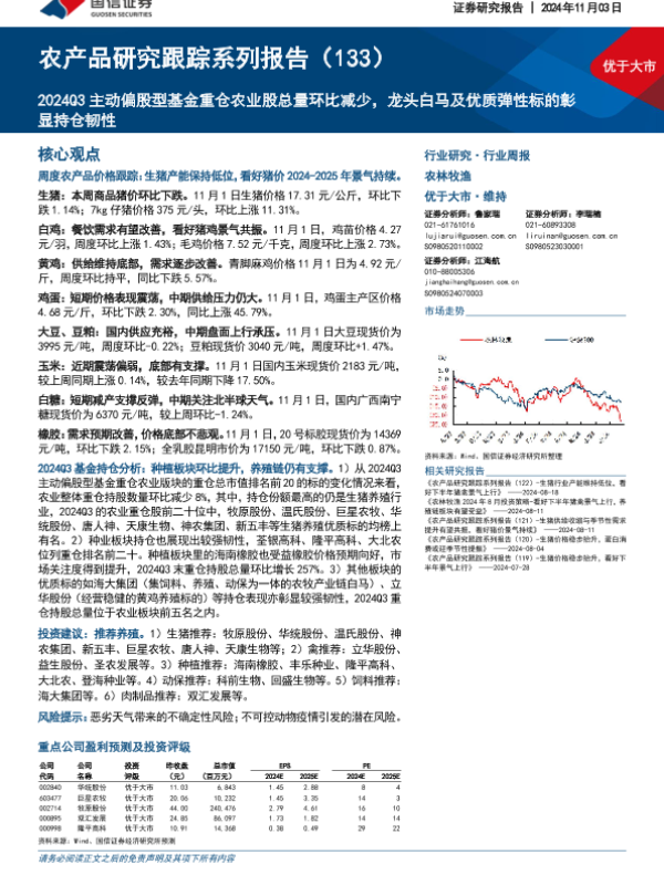 【国信证券】【20241103】2024Q3主动偏股型基金重仓农业股总量环比减少,龙头白马及优质弹性标的彰显持仓韧性-32页 行业研究