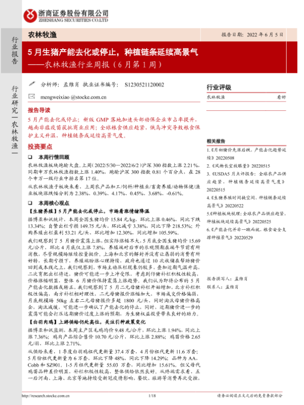 【浙商证券】【20220605】20220605-浙商证券-农林牧渔行业周报(6月第1周):5月生猪产能去化或停止,种植链条延续高景气-18页 行业研究