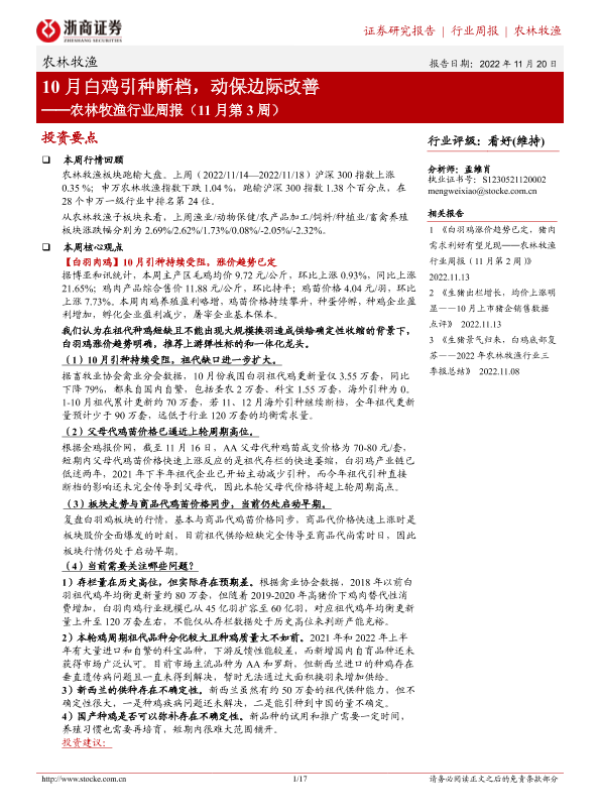 【浙商证券】【20221120】农林牧渔行业周报(11月第3周):10月白鸡引种断档,动保边际改善-17页 行业研究