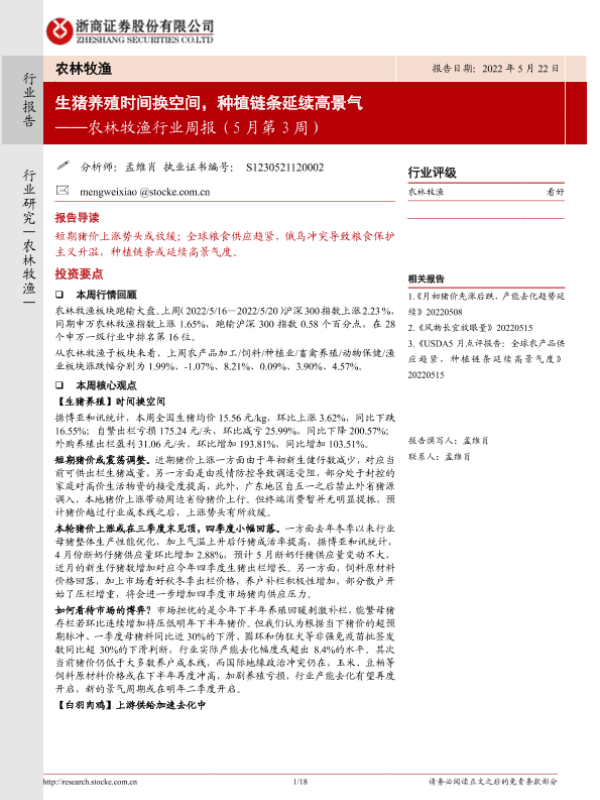 【浙商证券】【20220522】20220522-浙商证券-农林牧渔行业周报(5月第3周):生猪养殖时间换空间,种植链条延续高景气-18页 行业研究