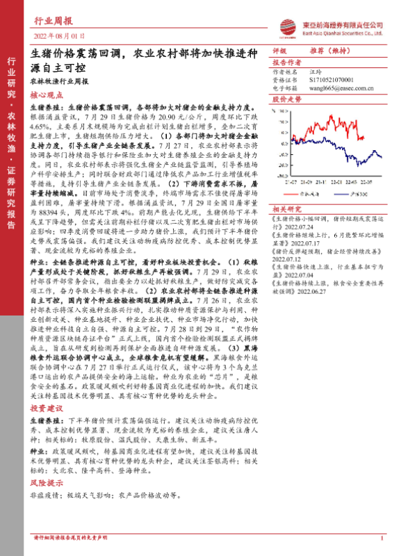 【东亚前海证券】【20220801】20220801-东亚前海证券-农林牧渔行业周报:生猪价格震荡回调,农业农村部将加快推进种源自主可控-17页 行业研究