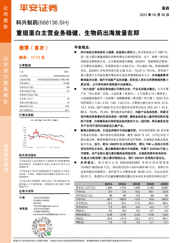 【平安证券】【20230906】20230906-平安证券-科兴制药-688136.SH-首次覆盖报告:重组蛋白主营业务稳健,生物药出海放量在即-22页 行业研究