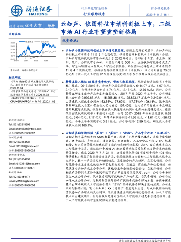 【海通证券】【20201116】信息服务行业跟踪报告:云知声、依图科技申请科创板上市,二级市场AI行业有望重塑新格局-3页 行业研究