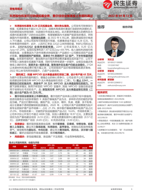 【民生证券】【20220912】零售周观点:科思股份拟发行可转债拓展业务,敷尔佳创业板首发上市顺利通过-19页 行业研究