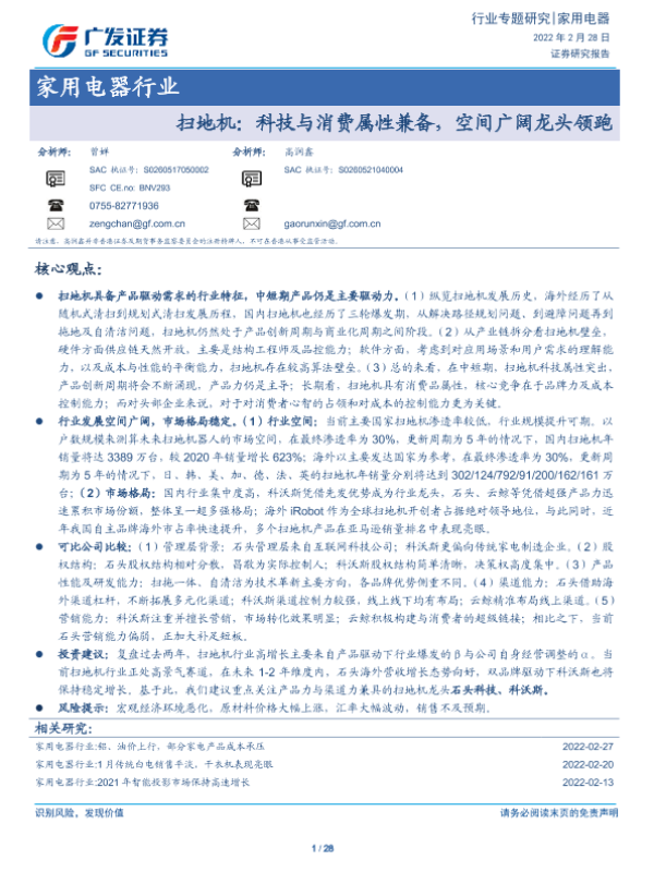 【广发证券】【20220228】家用电器行业:扫地机:科技与消费属性兼备,空间广阔龙头领跑-28页 行业研究