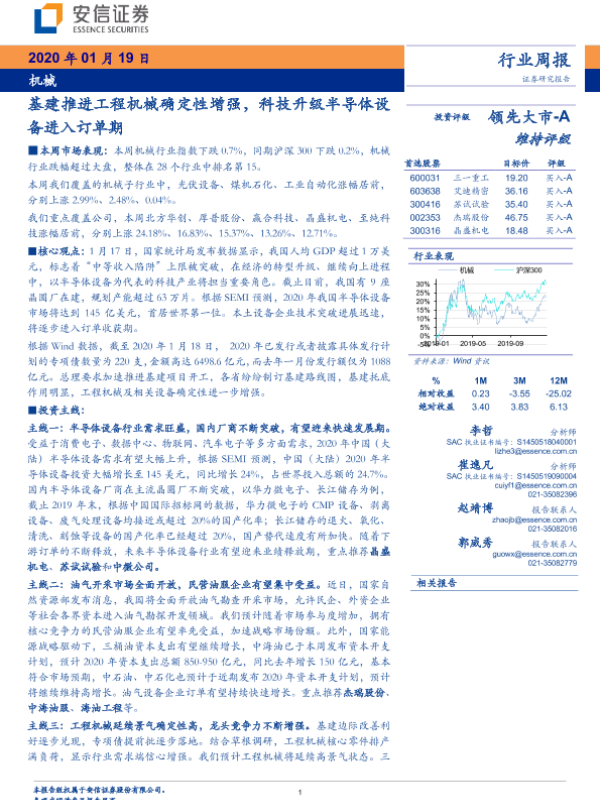 【安信证券】【20200119】机械行业周报:基建推进工程机械确定性增强,科技升级半导体设备进入订单期-26页 行业研究