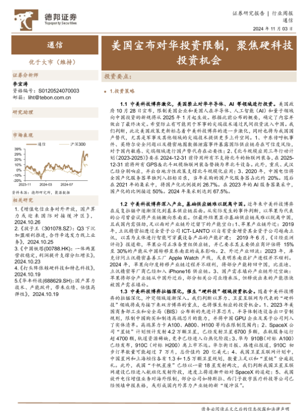 【德邦证券】【20241103】20241103-德邦证券-通信行业周报:美国宣布对华投资限制,聚焦硬科技投资机会-20页 行业研究