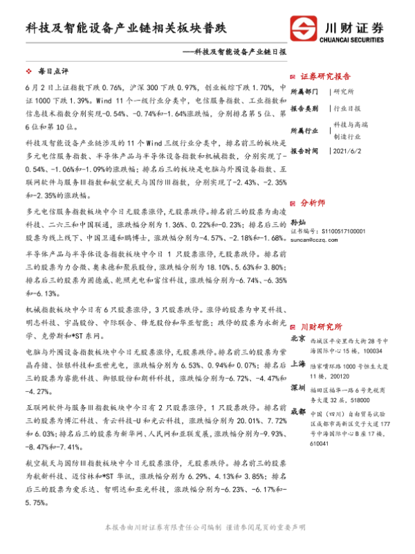 【川财证券】【20210629】科技及智能设备产业链日报:科技及智能设备产业链普跌-4页 证券期货研究报告