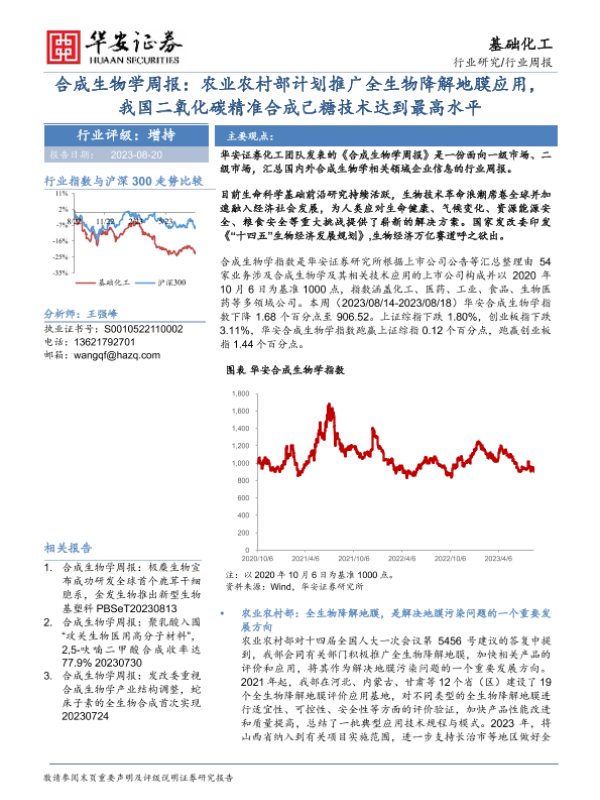 【华安证券】【20230820】20230820-华安证券-合成生物学周报:农业农村部计划推广全生物降解地膜应用,我国二氧化碳精准合成己糖技术达到最高水平-19页 行业研究