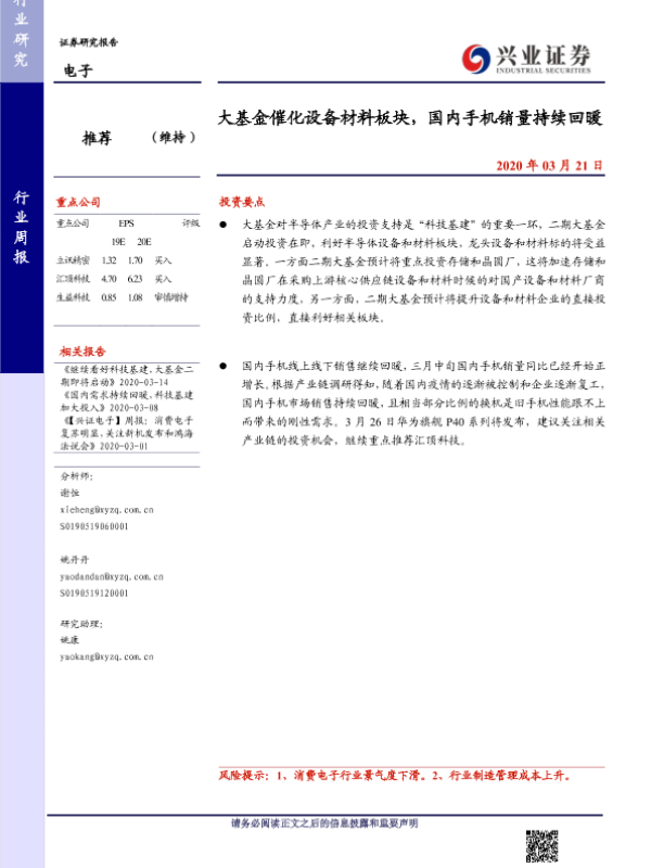 【兴业证券】【20200321】20200321-兴业证券-电子行业周报:大基金催化设备材料板块,国内手机销量持续回暖-9页 行业研究