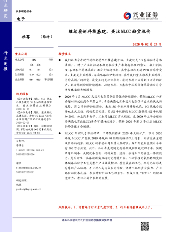 【兴业证券】【20200223】20200223-兴业证券-电子行业周报:继续看好科技基建,关注MLCC缺货涨价-11页 行业研究