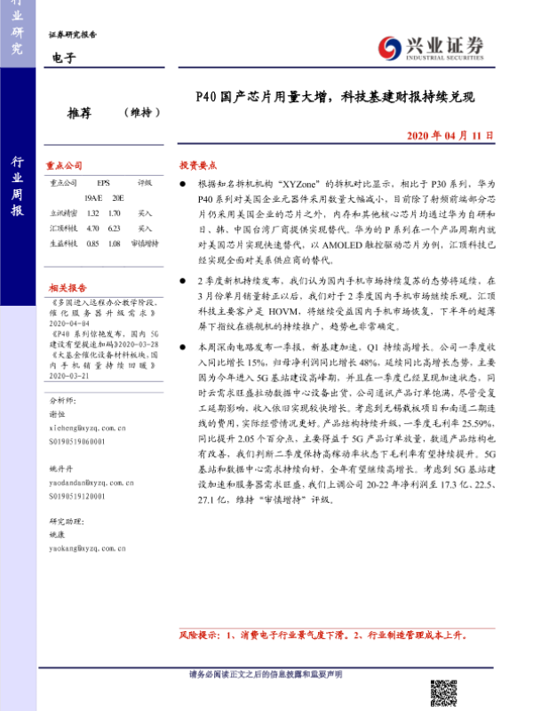 【兴业证券】【20200411】20200411-兴业证券-电子行业周报:P40国产芯片用量大增,科技基建财报持续兑现-8页 行业研究