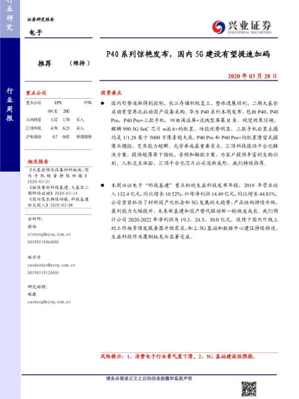 【兴业证券】【20200328】20200328-兴业证券-电子行业周报:P40系列惊艳发布,国内5G建设有望提速加码-9页 行业研究