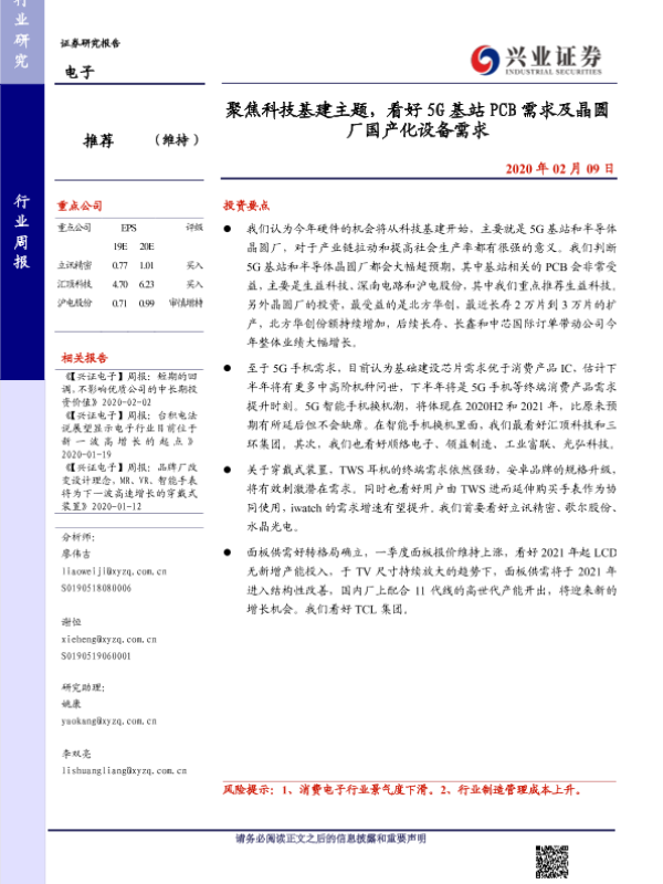 【兴业证券】【20200209】20200209-兴业证券-电子行业周报:聚焦科技基建主题,看好5G基站PCB需求及晶圆厂国产化设备需求-10页 行业研究