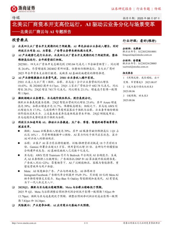 【浙商证券】【202508】北美云厂商资本开支高位运行,AI驱动云业务分化与场景变革-11页 证券期货研究报告