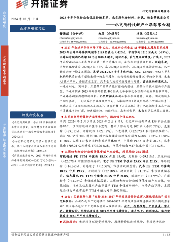 【开源证券】【20240217】北交所科技新产业跟踪第六期:2023年半导体行业由低谷持续复苏,北交所包含材料、测试、设备等优质公司-13页 行业研究