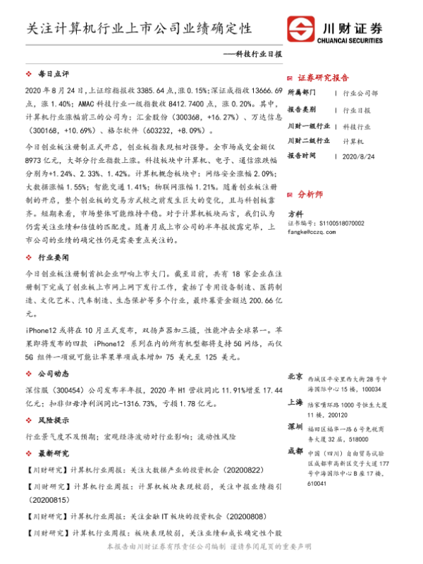 【川财证券】【20200824】科技行业日报:关注计算机行业上市公司业绩确定性-3页 证券期货研究报告