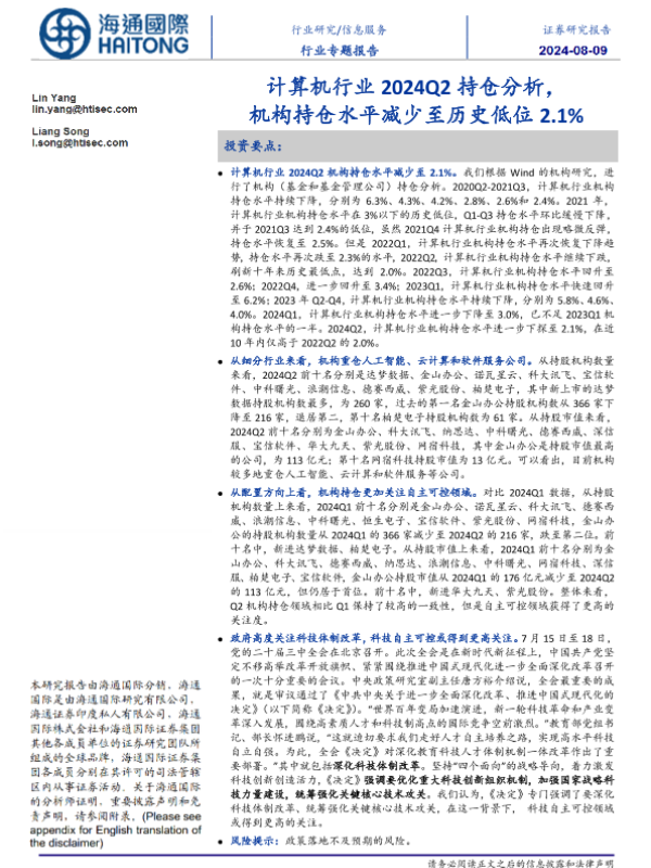 【海通国际】【20240809】20240809-海通国际-信息服务行业专题报告:计算机行业2024Q2持仓分析,机构持仓水平减少至历史低位2.1%-10页 行业研究