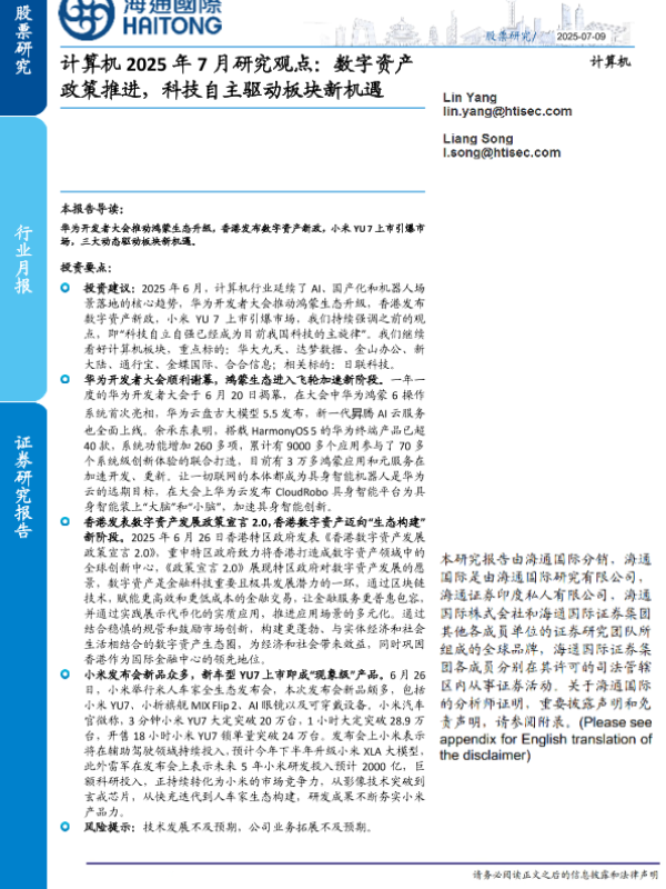 【海通国际】【20250709】计算机2025年7月研究观点:数字资产政策推进,科技自主驱动板块新机遇-13页 行业研究