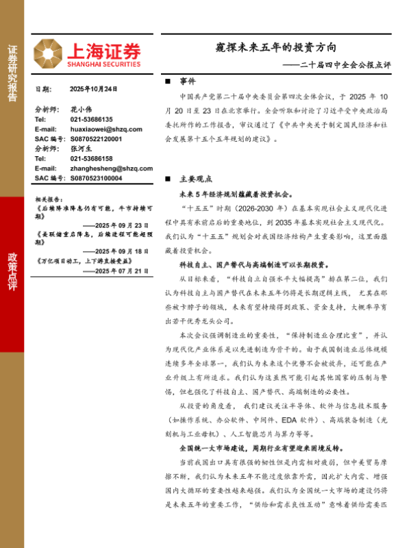 【上海证券】【202510】窥探未来五年的投资方向——二十届四中全会公报点评-3页 证券期货研究报告