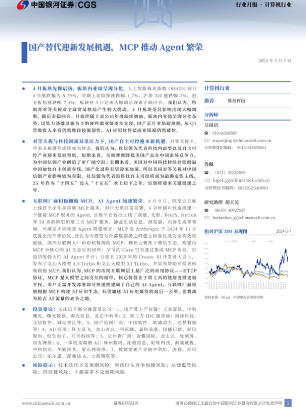 【银河证券】【20250507】计算机行业行业月报:国产替代迎新发展机遇,MCP推动Agent繁荣-24页 行业研究