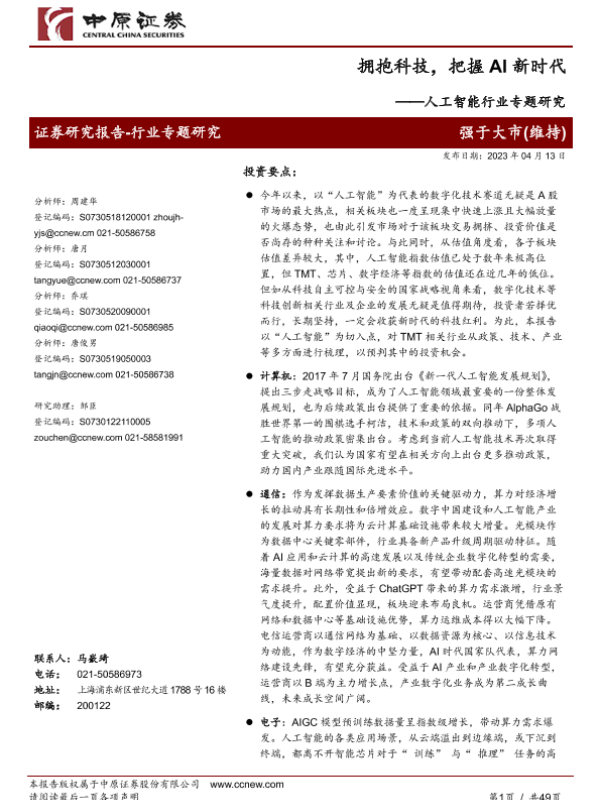 【中原证券】【20230413】2023-04-14-人工智能行业专题研究-拥抱科技-把握AI新时代-49页 行业研究