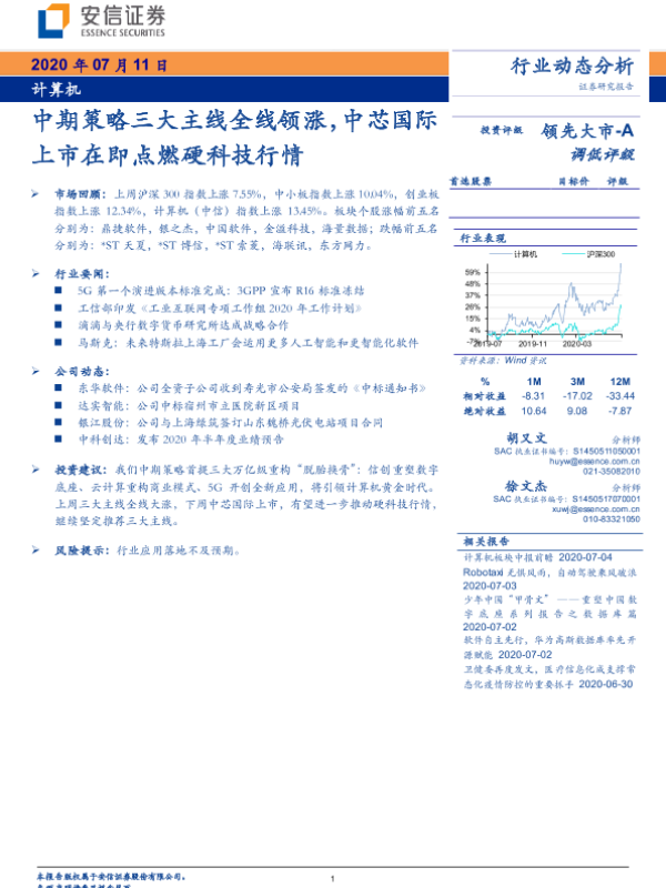 【安信证券】【20200711】计算机行业动态分析:中期策略三大主线全线领涨,中芯国际上市在即点燃硬科技行情-14页 行业研究