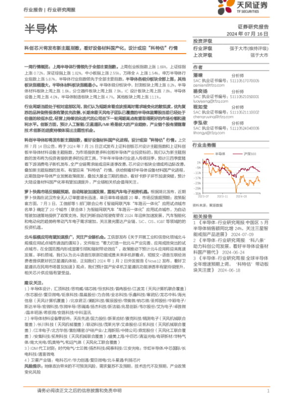 【天风证券】【20240716】20240716-天风证券-半导体行业研究周报:科创芯片将发布新主题指数,看好设备材料国产化,设计或迎“科特估”行情-35页 行业研究
