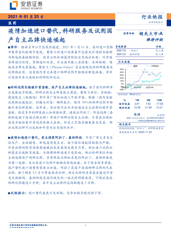 【安信证券】【20210125】疫情加速进口替代,科研服务及试剂国产自主品牌快速崛起-3页 行业研究