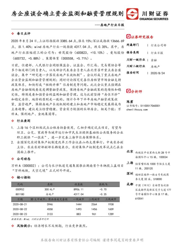 【川财证券】【20200824】房企座谈会确立资金监测和融资管理规则-3页 证券期货研究报告