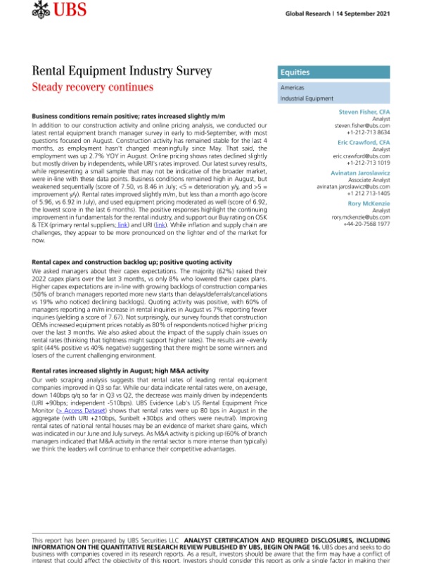【瑞银】【20210914】瑞银-美股工业设备行业-租赁设备行业调查:稳步复苏仍在继续-25页 行业研究