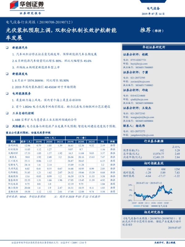 【华创证券】【20190714】电气设备行业周报:光伏装机预期上调,双积分机制长效护航新能车发展-27页 行业研究