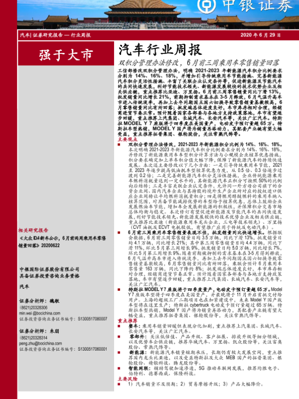 【中银证券】【20200629】20200629-中银证券-汽车行业周报:双积分管理办法修改,6月前三周乘用车零售销量回落-13页 行业研究