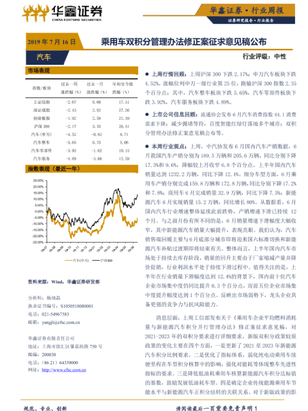 【华鑫证券】【20190716】20190716-华鑫证券-汽车行业周报:乘用车双积分管理办法修正案征求意见稿公布-19页 行业研究