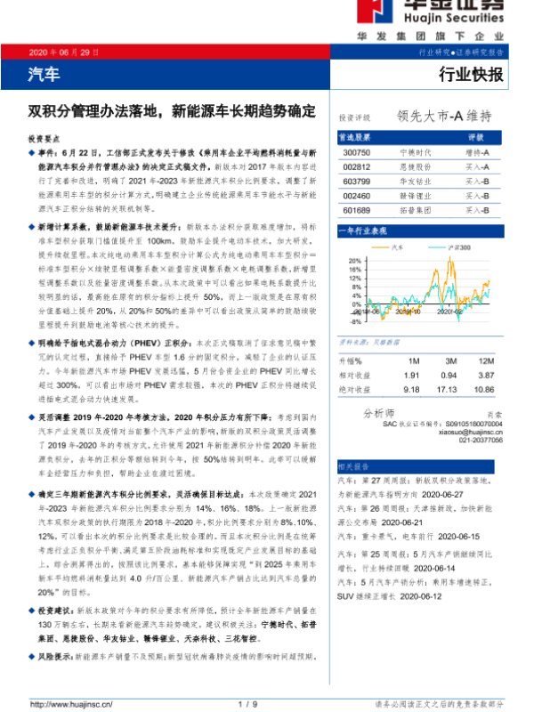 【华金证券】【20200629】汽车:双积分管理办法落地,新能源车长期趋势确定-9页 行业研究