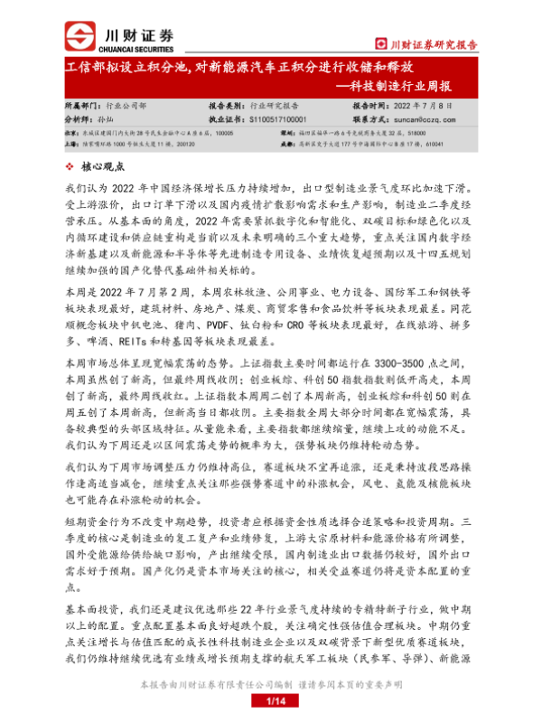 【川财证券】【20220708】20220708-川财证券-科技制造行业周报:工信部拟设立积分池,对新能源汽车正积分进行收储和释放-14页 行业研究