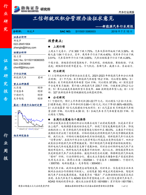 【渤海证券】【20190715】新能源汽车行业周报:工信部就双积分管理办法征求意见-12页 行业研究