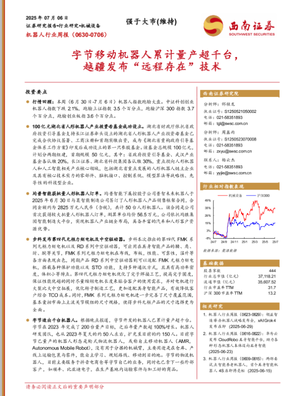 【西南证券】【20250706】机器人行业周报:字节移动机器人累计量产超千台,越疆发布“远程存在”技术-12页 行业研究