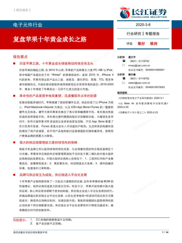 【长江证券】【20200308】电子元件行业:复盘苹果十年黄金成长之路-15页 行业研究