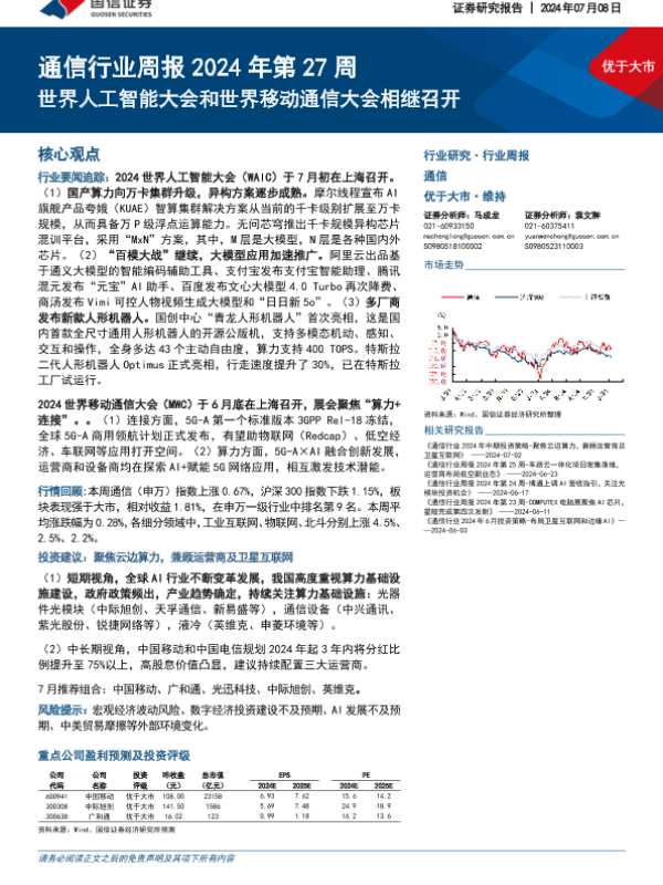 【国信证券】【20240708】通信行业周报2024年第27周:世界人工智能大会和世界移动通信大会相继召开-30页 行业研究