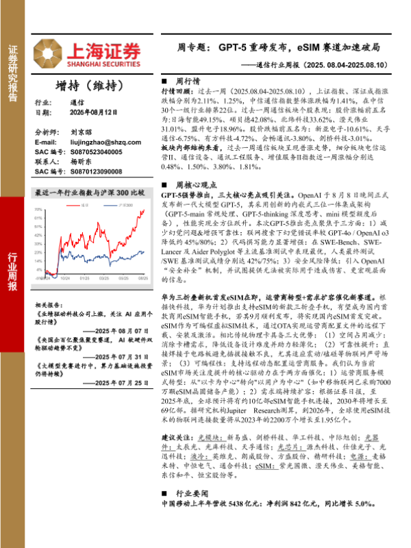 【上海证券】【20250812】通信行业周报:周专题,GPT-5重磅发布,eSIM赛道加速破局-9页 证券期货研究报告