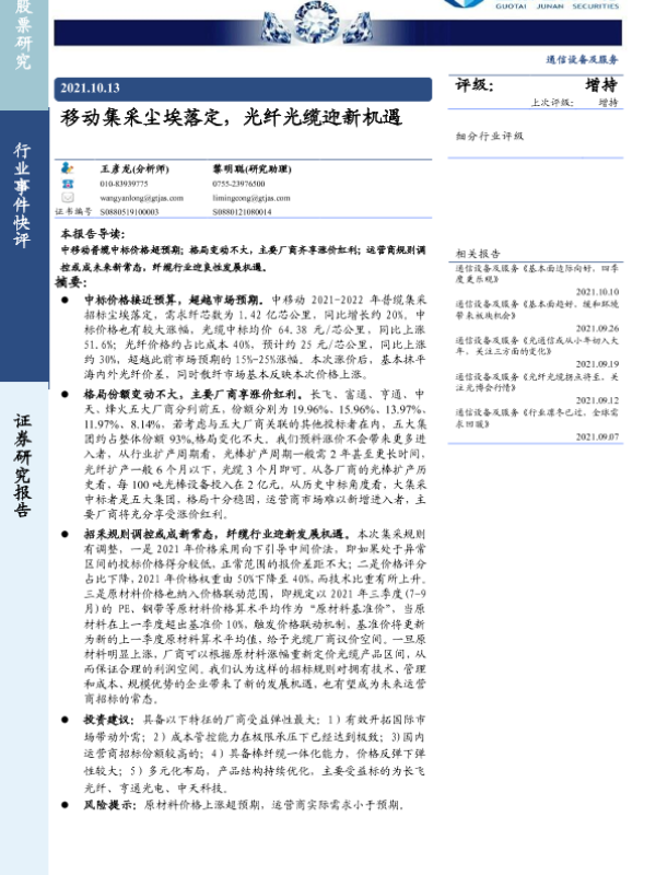 【国泰君安证券】【20211013】移动集采尘埃落定,光纤光缆迎新机遇-8页 行业研究